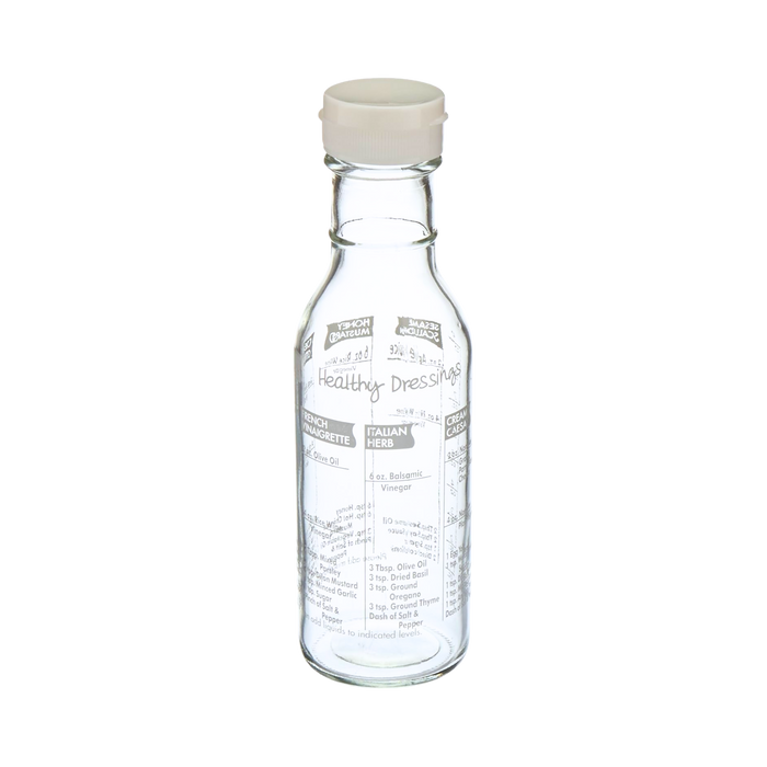 Handy glass shaker with airtight lid features 6 tasty low-fat recipes including French Vinaigrette, Italian Herb, Creamy Caesar, Sesame Scallion, Honey Mustard, and Creamy Citrus Ginger. Features measuring guidelines and instructions right on the bottle!